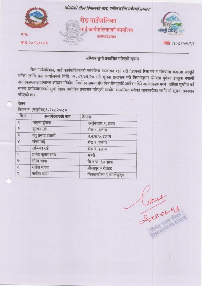 संम्क्षिप्त सूची प्रकाशित गरिएको सूचना ।
