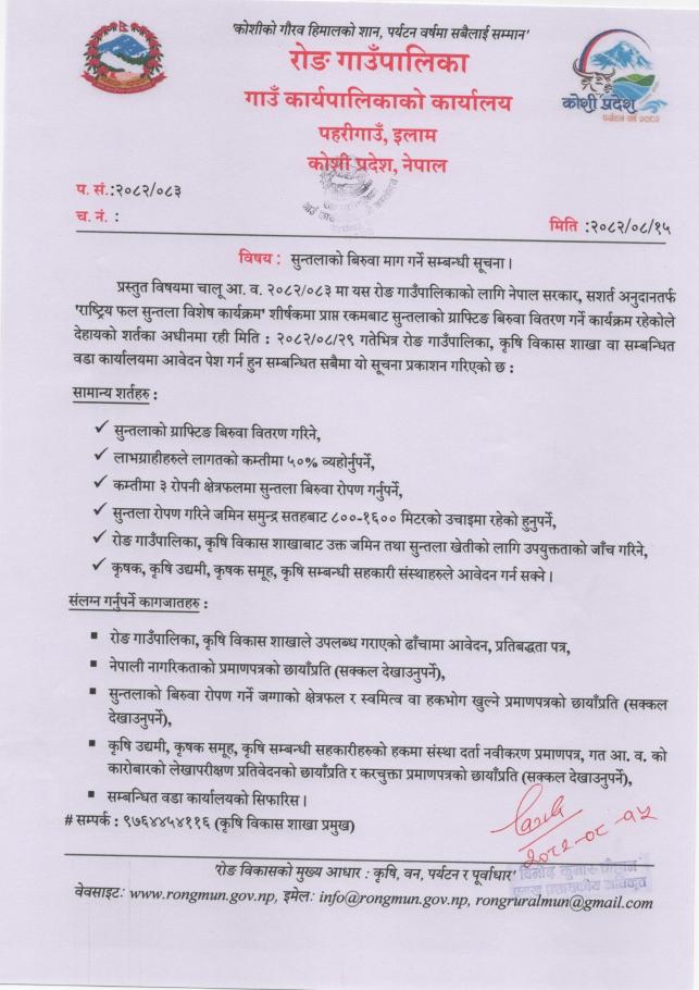 सुन्तलाको बिरुवा माग गर्ने सम्बन्धी सूचना ।