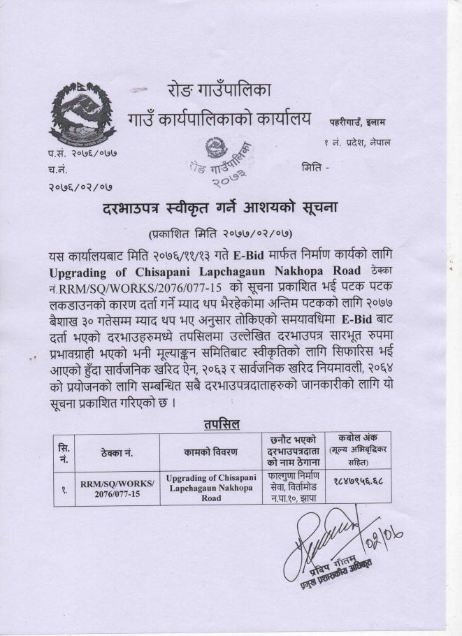 बोलपत्र स्वीकृत गर्ने आशयको सूचना ।