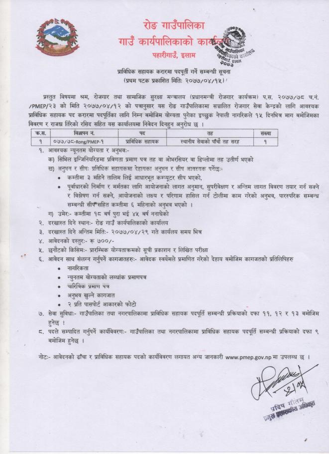 प्राविधिक सहायक करारमा पदपूर्ति गर्ने सम्बन्धी सूचना