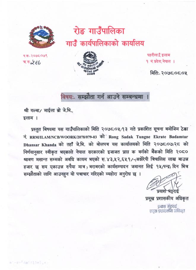 बोलपत्र स्वीकृत गर्ने आशयको सूचना ।